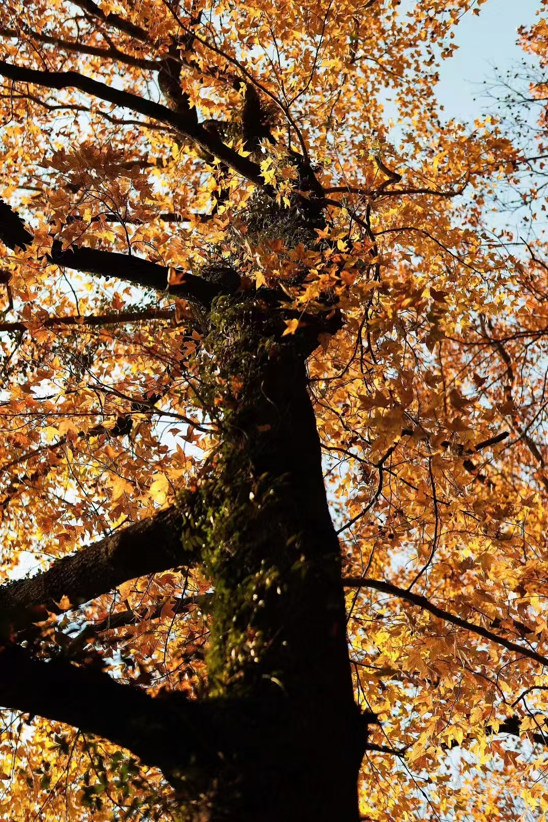 她的气息,便是凄凉的秋风,不像夏风那样,带着闷热的重量,而是薄薄的、凉凉的,像一块洗净晾干了的灰蓝绸布,从你皮肤上轻轻拂过。掠过树林时,便是她纤长的手指在翻动书页。金黄漫染了树梢,带着秋的印记,三三两两地在空中飘荡。那不是凋零,倒像是她送出的无数封烫金的信笺,告知天地万物时序的更迭。
