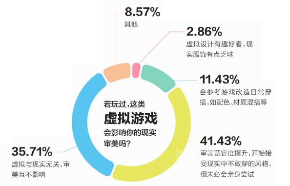 33.82%的同学玩过换装、穿搭类虚拟游戏,而这些游戏也在悄悄影响现实审美 ,虚拟穿搭成了他们拓展审美边界的试验场。