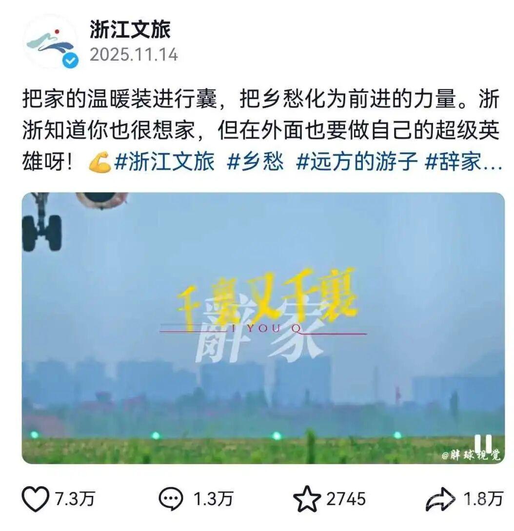 浙江文旅也发布了自己的《辞家千里又千里》版本,画面一出,江浙学子直接破防:“我为什么辞家干里又千里,你不知道吗!”