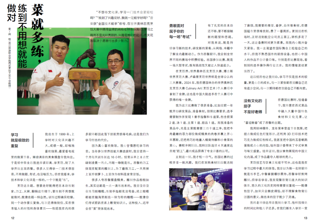 曾荣获“全国技术能手”称号、在世界奥林匹克烹饪大赛中摘得金牌的阎晗老师告诉我们,学习之路并不是光鲜亮丽的,兴趣是我们的起点,而天花板取决于愿意付出多少努力。
