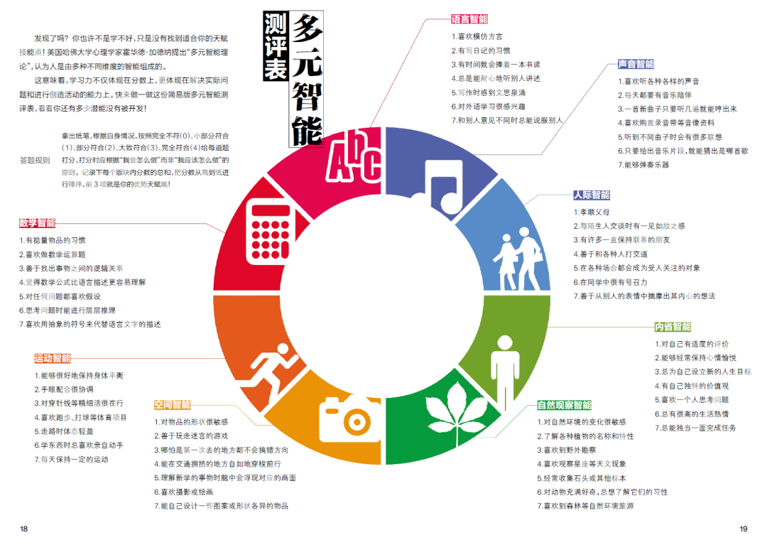 这意味着,学习力不仅体现在分数上,更体现在解决实际问题和进行创造活动的能力上。本期小编精心准备了一份简易版多元智能测评表,打开杂志做一做,看看你还有多少潜能没有被开发!