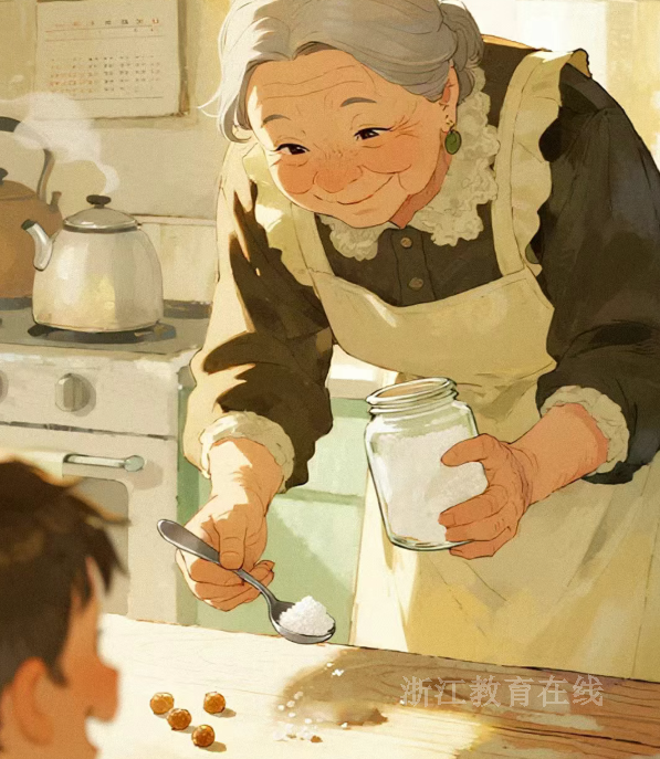后来,我离开了老家,来到城里读书。也是在厨房里,我看见了一个差不多的罐子,里面也装满了白色的小颗粒。我欣喜地拿了一点尝了尝,好像尝到一样的甜就能回到和奶奶在一起的好时光。可是传到嘴里的却是一股苦味,这时我才明白什么是糖,什么又是盐。可是这时我已经无法向她撒娇要糖吃了。
