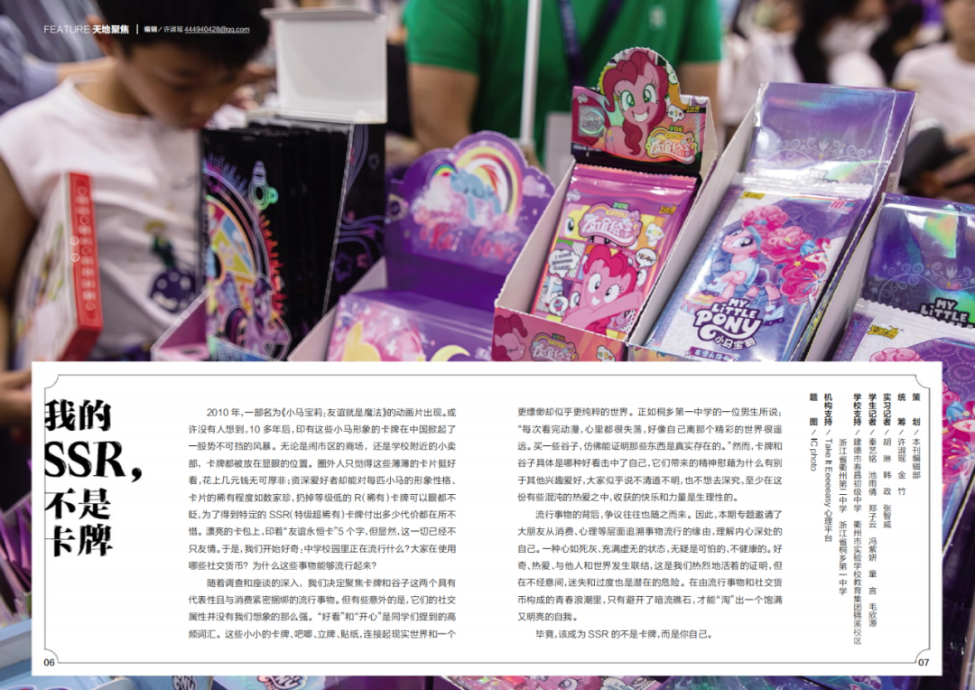 我最喜欢三月《我的SSR,不是卡牌》这期专题。首先,“社交货币”这一选题贴近校园生活,聚焦中学生中流行的卡牌、谷子等,精准戳中校园里的真实潮流现象,让我们学生读者产生共鸣,因为我自己有时候也会喜欢抽卡牌。其次,文中引用了学生的真实感受,语言通俗自然,又理性思考审视,既有温度又有深度,读起来不枯燥。最后点出“成为SSR的不是卡牌,而是你自己”,把话题升华为自我成长,传递了积极的价值观。