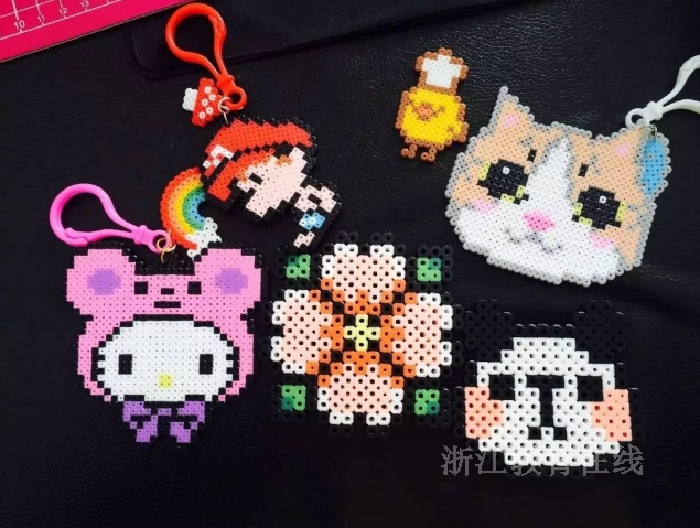 拼豆不只是“做出来”,更重要的是可以带出去。它可以挂在书包、笔袋、钥匙扣上,成为一种无声的表达。