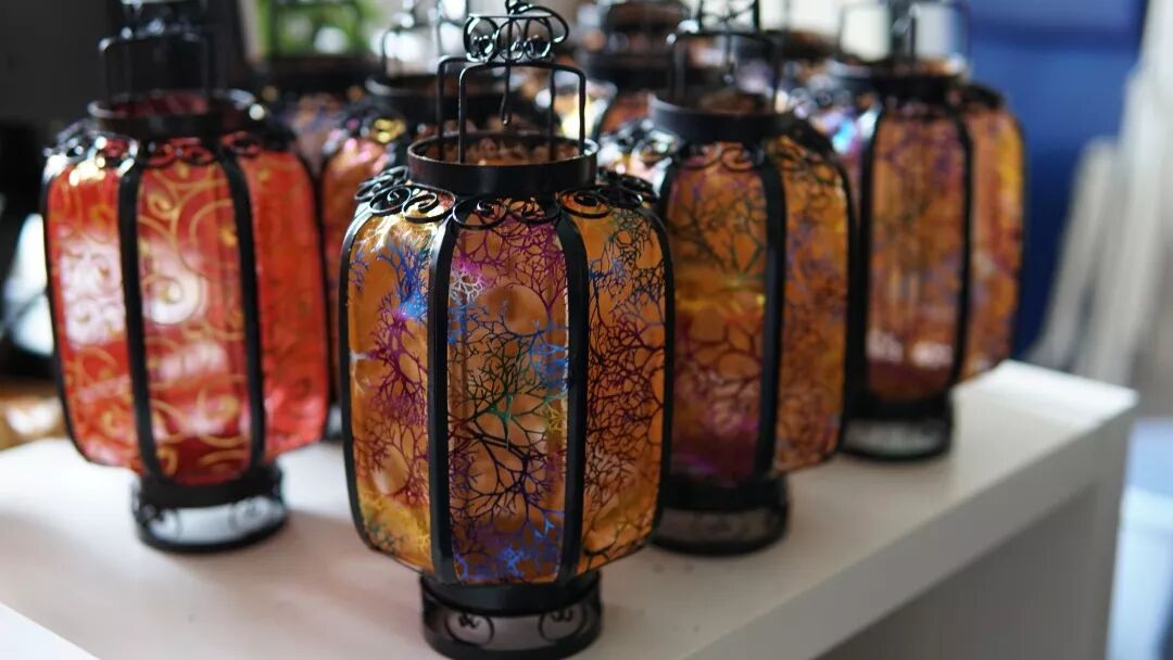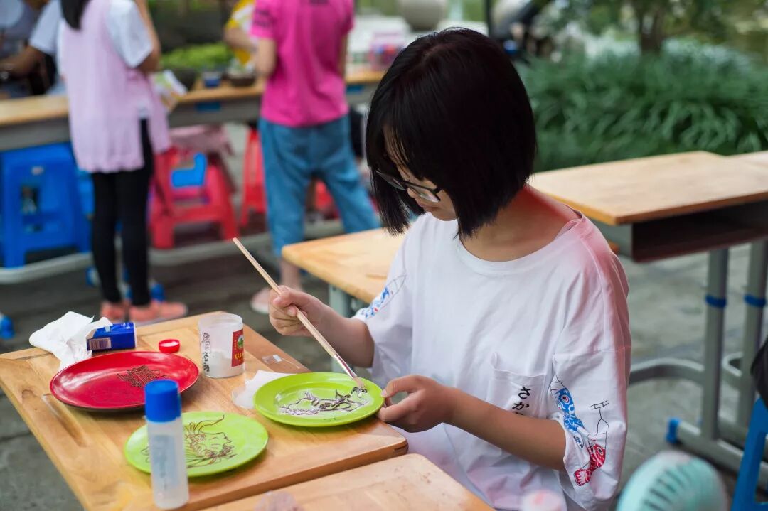 隔壁泥金彩漆的摊位也是安静的,来自四明中学泥金彩漆社的社员正在专心地为盘子里的图案贴金。