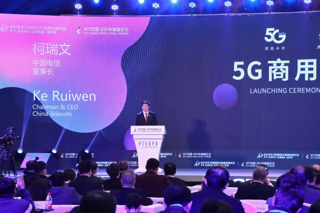 2019年10月31日,在2019年中国国际信息通信展览会开幕式上,工业和信息化部副部长陈肇雄、中国电信、中国移动、中国联通、中国铁塔董事长共同启动5G商用。